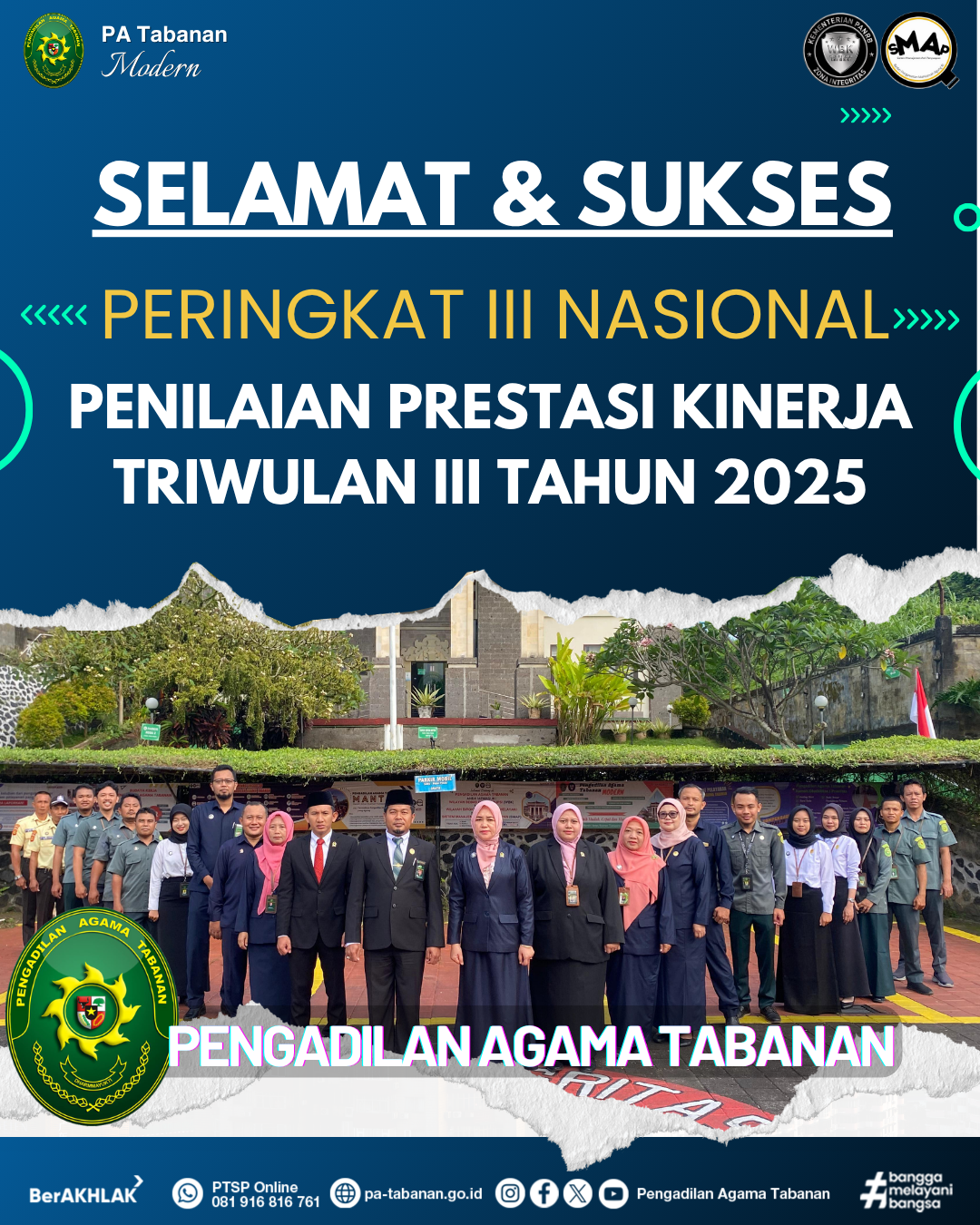 Tabanan, 21 Oktober 2025 — Pengadilan Agama Tabanan kembali menorehkan prestasi membanggakan di tingkat nasional. Berdasarkan pengumuman resmi dari Direktorat Jenderal Badan Peradilan Agama (Badilag) Mahkamah Agung RI, PA Tabanan berhasil meraih Peringkat III Nasional dalam Penilaian Prestasi Kinerja Satuan Kerja di Lingkungan Peradilan Agama untuk Triwulan III Tahun 2025 dengan nilai 93,88.