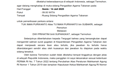 Pada hari ini Selasa tanggal 15 Juli 2025 Saya Laksana Indra Setiawan, A.Md.A.B. sebagai Jurusita Pengganti pada Pengadilan Agama Tabanan…