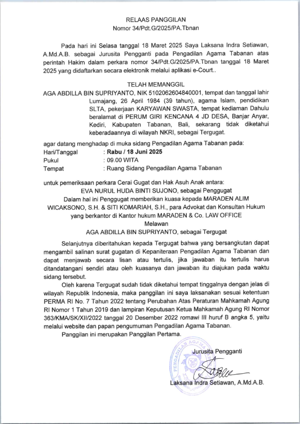 Panggilan Pertama Perkara Ghoib Nomor 34/Pdt.G/2025/PA.Tbnan atas nama AGA ABDILLA BIN SUPRIYANTO, NIK 5102062604840001, tempat dan tanggal lahir Lumajang, 26 April 1984 (39 tahun), agama Islam, pendidikan SLTA, pekerjaan KARYAWAN SWASTA, tempat kediaman Dahulu beralamat di PERUM GIRI KENCANA 4 JD DESA, Banjar Anyar, Kediri, Kabupaten Tabanan, Bali, sekarang tidak diketahui keberadaannya di wilayah NKRI.