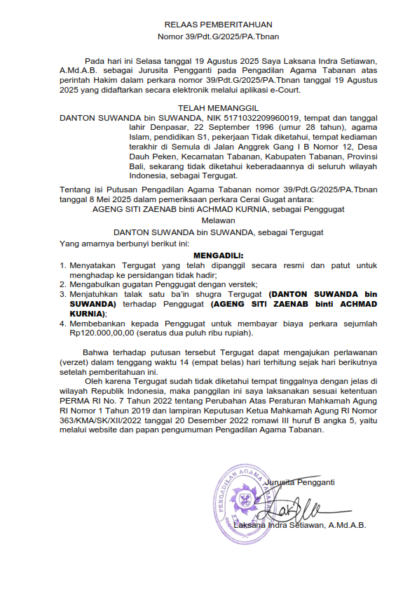 Pada hari ini Selasa tanggal 19 Agustus 2025 Saya Laksana Indra Setiawan, A.Md.A.B. sebagai Jurusita Pengganti pada Pengadilan Agama Tabanan atas perintah Hakim dalam perkara nomor 39/Pdt.G/2025/PA.Tbnan tanggal 19 Agustus 2025 yang didaftarkan secara elektronik melalui aplikasi e-Court.